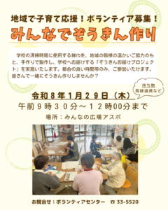 また、みんなで集まり雑巾を作るボランティア活動をみんなの広場アスボで1月29日(木)9時30分から12時まで行います。多くの皆さまのご協力をお待ちしております。